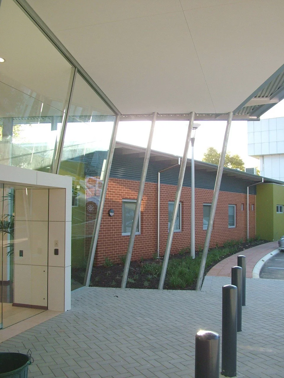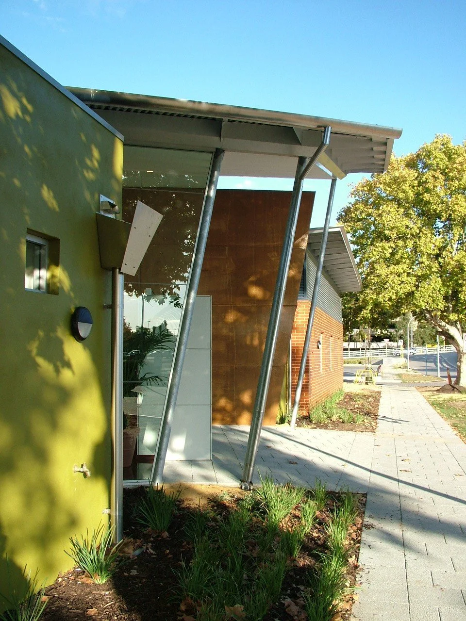 The human scale of the building has been created with a structure of long, low lines. The central foyer has an exaggerated height and connects the internal and external environments through the use of fully glazed walls to the north and south and highlighted glazing to the east. The foyer serves as an informal meeting place and a reference for the rest of the building. The foyer’s central axis aligns with some large trees which are deemed to have cultural significance. Sun control to the walls in the foyer is maintained through the central rooves, eaves and canopies to the entrance.